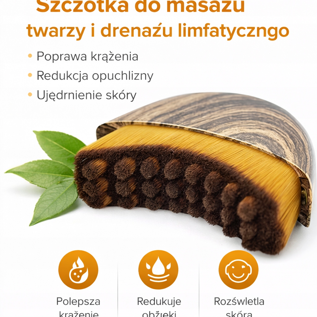 Masaż szczotką pobudza mikrokrążenie i przepływ limfy, co wspiera usuwanie nadmiaru wody i toksyn z tkanek twarzy, redukując opuchliznę bez zabiegów i igieł